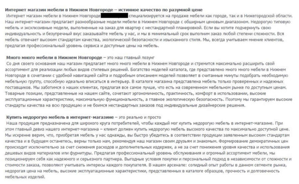 Яндексу такой текст тоже не понравится — подозрительно много ключевых слов. Плюс со смыслом явные проблемы. Сразу видно: данный контент создан только ради оптимизации, а никак не для людей.