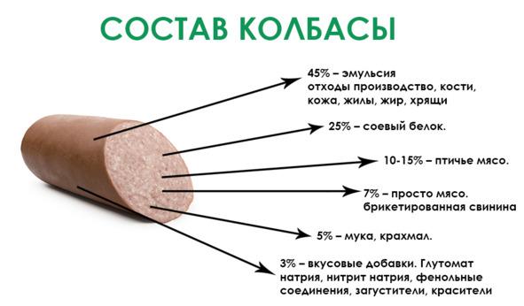 Аналогично сарделькам, только вместо птичьего мяса идёт феpментиpованная свиная кожа, нyтpяное и некондиционное подкожное сало.