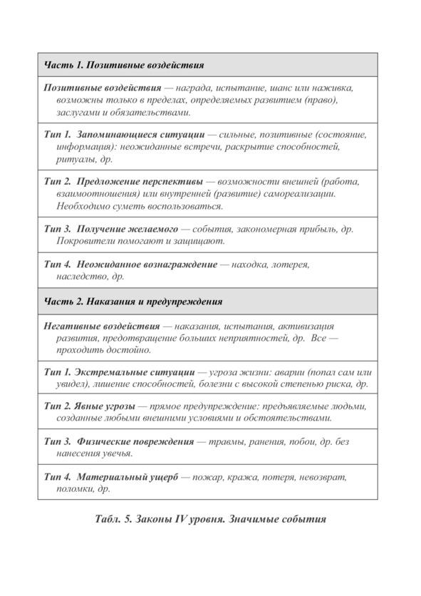 Законы IV уровня выводят некоторые решения Высших Сил на физический уровень. Многие воздействия идут по Тонкому Миру, и человек не всегда может их воспринять, особенно когда не хватает энергии (на 50 магий больше или меньше — все равно ничего не почувствует). Поэтому эти ощущения выводятся на физический уровень, чтобы не заметить их было уже невозможно. И нужно научиться читать самые значимые жизненные ситуации как открытую книгу.