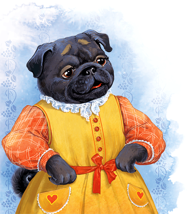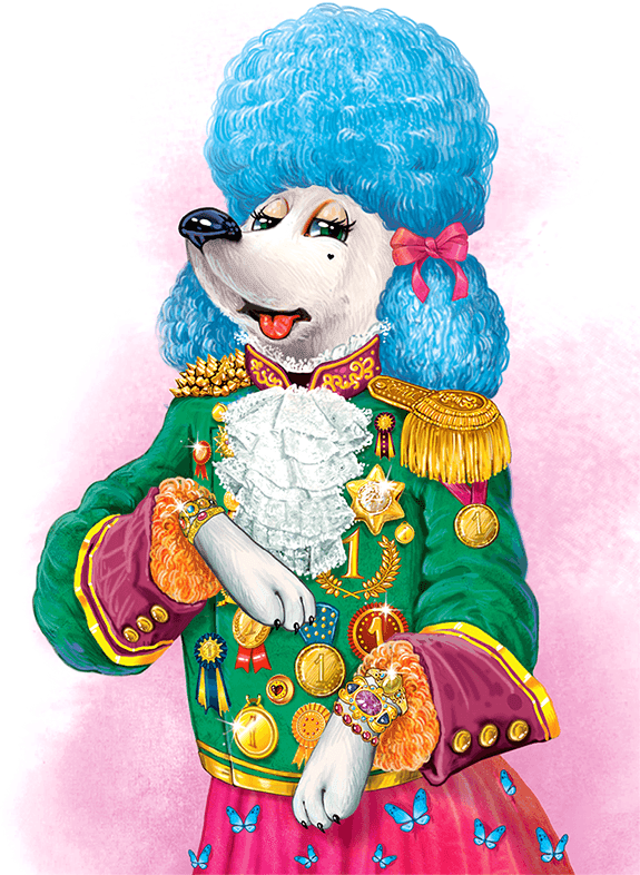 Марсия обернулась и увидела на пороге комнаты странное создание. На секунду мопсихе показалось, что перед ней пудель. Но разве у них бывает ярко-голубая шерсть на голове и оранжево-красная на передних лапах? И одето это создание оказалось странно. На его торсе красовался короткий военный китель, украшенный таким количеством орденов, что самого мундира практически не было видно, а из-под него торчала розовая короткая юбочка, расшитая голубыми бабочками.