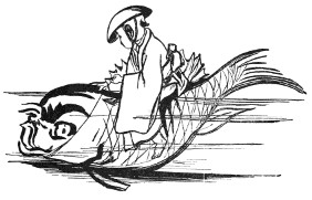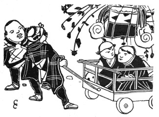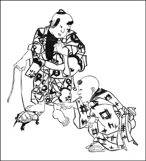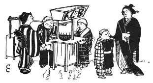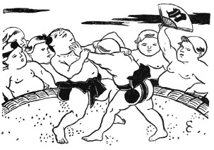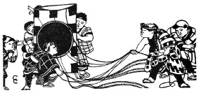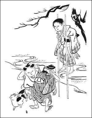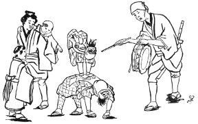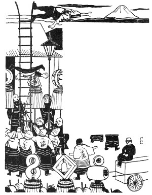 After the heavy autumn rains have filled the roads with big puddles, it is great fun, this boy thinks, to walk about on stilts. You see him on page 11. His stilts are of bamboo wood, and he calls them "Heron-legs," after the long-legged snowy herons that strut about in the wet rice-fields. When he struts about on them, he wedges the upright between his big and second toe as if the stilt was like his shoes. He has a good view of his two friends who are wrestling, and probably making hideous noises like wild animals as they try to throw one another. They have seen fat public wrestlers stand on opposite sides of a sanded ring, stoop, rubbing their thighs, and in a crouching attitude and growling, slowly advance upon one another. Then when near to one another, the spring is made and the men close. If after some time the round is not decided by a throw, the umpire, who struts about like a turkey-cock, fanning himself, approaches. He plucks the girdle of the weaker combatant, when the wrestlers at once retire to the sides of the arena to rest, and to sprinkle a little water over themselves.