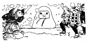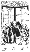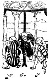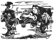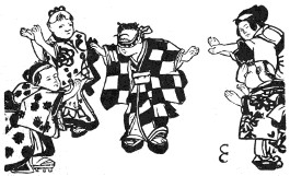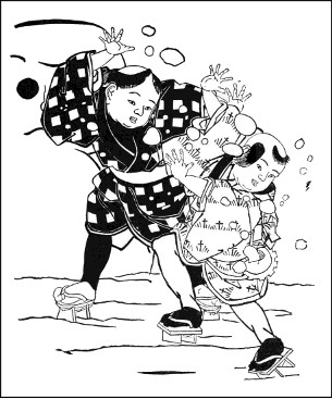 In the second large picture two of the little boys are playing at snowball. Although it may be hotter in the summer in their country than it is here, the winter is as cold as you feel it. Like our own boys, these lads enjoy a fall of snow, and still better than snowballing they like making a snowman with a charcoal ball for each eye and a streak of charcoal for his mouth. The shoes which they usually wear out of doors are better for a snowy day than your boots, for their feet do not sink into the snow, unless it is deep. These shoes are of wood, and make a boy seem to be about three inches taller than he really is. The shoe, you see, has not laces or buttons, but is kept on the foot by that thong which passes between the first and second toe. The thong is made of grass, and covered with strong paper, or with white or colored calico. The boy in the check dress wears his shoes without socks, but you see the other boy has socks on. His socks are made of dark blue calico, with a thickly woven sole, and a place, like one finger of a glove, for his big toe. If you were to wear Japanese shoes, you would think the thong between your toes very uncomfortable. Yet from their habit of wearing this sort of shoe, the big toe grows more separate from the other toes, and the skin between this and the next toe becomes as hard as the skin of a dog's or a cat's paw.