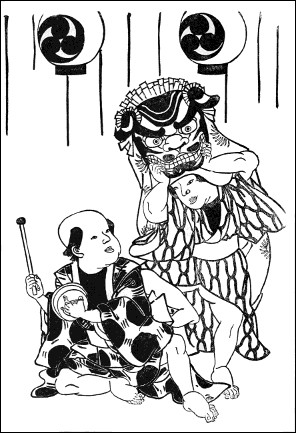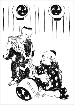 The child sitting down has a drum. His drum and the paper lanterns hanging up have painted on them an ornament which is also the crest of the house of "Arima."[2] If these boys belong to this family they wear the same crest embroidered on the centre of the backs of their coats.