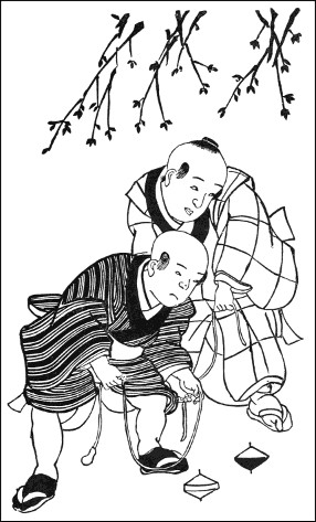 The tops the lads are playing with in this picture are not quite the same shape as our tops, but they spin very well. Some men are so clever at making spinning-tops run along strings, throwing them up into the air and catching them with a tobacco-pipe, that they earn a living by exhibiting their skill.