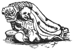 The tonsured oblique-eyed doll suggests the festival of similarly oblique-eyed little girls on the 3rd of March. Then dolls of every degree obtain for a day "Dolls' Rights." In every Japanese household all the dolls of the present and previous generations are, on that festival, set out to best advantage. Beside them are sweets, green-speckled rice cake, and daintily gilt and lacquered dolls' utensils. For some time previous, to meet the increased demand, the doll shopman has been very busy. He sits before a straw-holder into which he can readily stick, to dry, the wooden supports of the plaster dolls' heads he is painting, as he takes first one and then another to give artistic touches to their glowing cheeks or little tongue. That dolly that seems but "so odd" to Polly or Maggie is there the cherished darling of its little owner. It passes half its day tied on to her back, peeping companionably its head over her shoulder. At night it is lovingly sheltered under the green mosquito curtains, and provided with a toy wooden pillow.