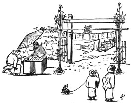Half-a-dozen of these dogs will lie in one place, stretched drowsily on the grassy city walls under the trees, during the daytime. Towards evening they rouse themselves and run off to yards and rubbish-heaps to pick up what they can. They will eat fish, but two or three dogs soon get to know where the meat-eating Englishmen live. They come trotting in regularly with a business-like air to search among the day's refuse for bones. Should any interloping dog try to establish a right to share the feast he can only gain his footing after a victorious battle. All these dogs are very wolfish-looking, with straight hair, which is usually white or tan-colored. There are other pet dogs kept in houses. These look something like spaniels. They are small, with their black noses so much turned up that it seems as if, when they were puppies, they had tumbled down and broken the bridge of their nose. They are often ornamented like dog Toby in "Punch and Judy," with a ruff made of some scarlet stuff round their necks.