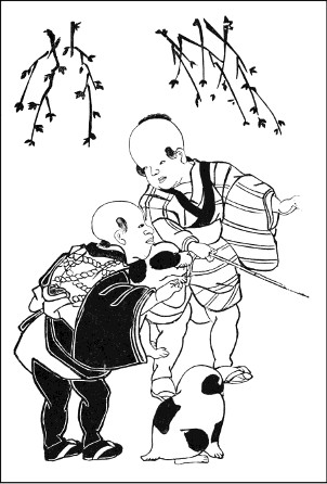 In the neighborhood in which the children shown in the picture live, there is a temple. In honor of the god a feast-day is held on the tenth of every month. The tenth day of the tenth month is a yet greater feast-day. On these days they go the first thing in the morning to the barber's, have their heads shaved and dressed, and their faces powdered with white, and their lips and cheeks painted pink. They wear their best clothes and smartest sashes. Then they clatter off on their wooden clogs to the temple and buy two little rice-cakes at the gates. Next they come to two large, comical bronze dogs sitting on stands, one on each side of the path. They reach up and gently rub the dog's nose, then rub their own noses, rub the dog's eyes, and then their own, and so on, until they have touched the dog's and their own body all over. This is their way of praying for good health. They also add another to the number of little rags that have been hung by each visitor about the dog's neck. Then they go to the altar and give their cakes to a boy belonging to the temple. In exchange he presents them with one rice-cake which has been blessed. They ring a round brass bell to call their god's attention, and throw him some money into a grated box as big as a child's crib. Then they squat down and pray to be good little boys. Now they go out and amuse themselves by looking at all the stalls of toys and cakes, and flowers and fish.