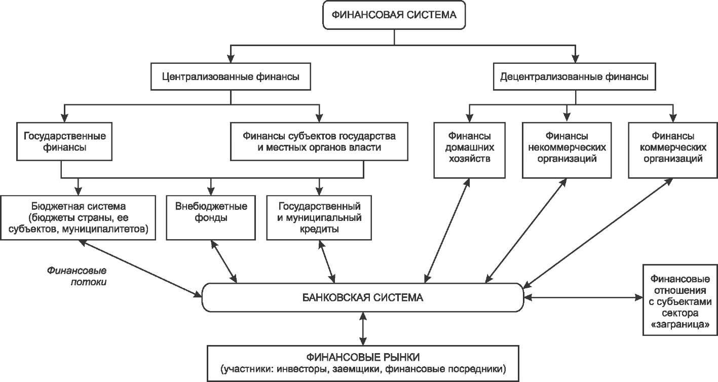 В нижней части схемы приведен блок «Финансовые рынки». В отличие от субъектов финансовых отношений, представленных в других блоках схемы, финансовый рынок выполняет посредническую функцию: он не является собственником финансовых ресурсов, а лишь помогает оптимизации использования совокупных финансовых ресурсов. Обособление этого блока обусловлено тем обстоятельством, что в современной теории финансов именно финансовые рынки рассматриваются как основной элемент системы финансирования крупного частного бизнеса, определяющего как глобальную, так и национальные экономические системы. Основными участниками финансовых рынков являются инвесторы и финансовые посредники (финансовые и инвестиционные компании, банкирские дома, инвестиционные фонды и др.); первые предлагают рынку свободные денежные средства, вторые организуют их размещение, а также помогают компаниям, нуждающимся в долгосрочном финансировании, найти оптимальную структуру источников средств.