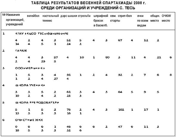 «Спортивная весна 2008» в с. Тесь. Шестого апреля завершилась весенняя спартакиада в с. Тесь. В играх участвовали спортсмены семи сельских организаций и учреждений (МОУ «Тесинская СОШ» №10, КГАУ «КЦСО «Тесь» (разные цеха, в т.ч. санаторий, гараж), коммунальщики, ОАО «Искра Ленина», ООО «Мельник»), мужчины, юноши, девушки, женщины. В каждой команде по четыре мужчины и по две женщины, в т.ч. более сорока участников защищали спортивную честь своих организаций.
