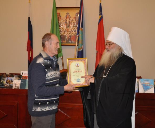 Митрополит Барнаульский и Алтайский Сергий вручает Виктору Вассбар диплом литературного конкурса имени святителя Макария.