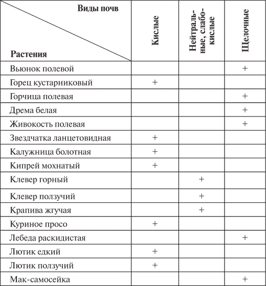 По растительности, которая преобладает на участке, возможно определить и кислотность почвы. В первую очередь нам помогут растения, с которыми все привыкли бороться, – сорняки. Безусловно, точный показатель pH по ним назвать нельзя, тем не менее табл. 1 позволит садоводу правильно сориентироваться и справиться с проблемами, внеся в почву соответствующие вещества.
