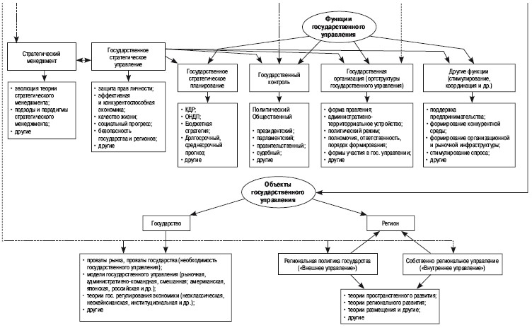 Категориальный аппарат теории государственного управления чрезвычайно многообразен. Это обусловлено широким перечнем выполняемых государством функций, используемых методов, сфер экономики и общественной жизни, подлежащих государственному регулированию, теорий и концепций государственного управления и др. В силу этого необходимо составить системное представление об основных категориях и понятиях государственного управления в их взаимосвязи, раскрыть их сущность и содержание. На основе системного подхода можно выделить четыре крупных блока для исследования государственного управления: субъекты государственного управления, его методология, функции и объекты. В контексте рассмотрения структуры данных блоков можно раскрыть особенности государственного управления, место и содержание категорий государственного управления, обосновать необходимость реформ государственной власти как неотъемлемого этапа модернизации, внедрения управленческих инноваций в систему государственного управления. На наш взгляд, это позволяет системно рассмотреть основные теории, концепции, модели государственного (включая региональное) управления, основные подходы и парадигмы стратегического управления и особенности их применения на государственном уровне, особенности, подходы и показатели оценки эффективности государственного управления и т. д.