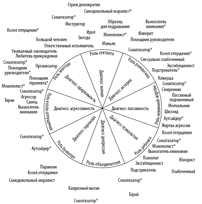Рис. 1.1. Типологическая структура распределения групповых ролей. Вне круга размещены пятьдесят ролевых функций, описанных в литературе по групповой терапии. Эти функции тяготеют к основным ролевым типам, расставленным по окружности, и соответствующим диагнозам. Ролевые функции, помеченные звездочкой, встречаются в схеме в нескольких местах. (Воспроизведено с разрешения издателей по книге H. Kellerman Group Psychotherapy and Personality, Grune & Stratton, Copyright 1979)