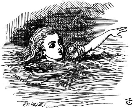 Однажды, когда Алиса была совсем маленькой, она была на море. Правда, она не очень хорошо представляла, какими бывают морские берега. Алиса вспомнила, как дети с деревянными лопатками копались в песке, а чуть подальше, за песчаной полосой, тянулся ряд домов, а недалеко от берега стояли пароходы. Однако Алиса быстро поняла, что попала не в море, а в озеро или в пруд, который образовался из её слёз, когда она была ростом до потолка.
