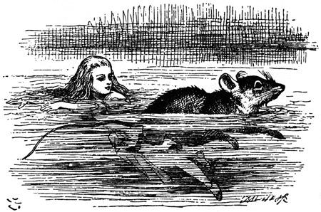 В это время недалеко от неё послышался громкий всплеск, и Алиса поплыла в ту сторону, чтобы посмотреть, кто бы это мог быть. В первую минуту ей пришло в голову, что это морж или бегемот, но потом она вспомнила, какой маленькой стала сама, и увидела, что навстречу ей плывёт мышка, которая, должно быть, так же как и она сама, нечаянно попала в этот слёзный пруд.