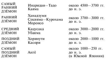 Деление эпохи Дзёмон на пять периодов объясняется таким ходом развития различных регионов Японии, при котором каждый из них последовательно пережил все стадии эволюции – о чем, кстати, свидетельствует и керамика, производившаяся в каждый из этих периодов. Это деление облегчило решение проблем взаимосвязей в каком-либо конкретном географическом регионе, которое свелось в основном к определению хронологической последовательности событий. Данная система деления хороша главным образом тем, что она дает возможность использовать удобную терминологию; однако идеализм этой системы едва ли компенсирует недостаток реализма. В настоящее время эту точку зрения разделяют почти все ученые, занимающиеся эпохой Дзёмон. Тем не менее – по крайней мере в том, что касается ранних периодов – существуют достоверные свидетельства того, что благодаря концентрации определенных типов в небольших ограниченных местностях происходили и параллельные эволюции этих типов. Поскольку точная и последовательная система хронологии требует наличия точной терминологии, мы дадим характеристику доисторической эпохи Дзёмон с помощью приведенной ниже краткой системы хронологизации. Используемые в ней названия взяты главным образом по аналогии с типами керамики, последовательно существовавшими на равнине Канто, – это объясняется тем, что данные типы керамики известны всем специалистам. Однако использование этих названий ни в коем случае не основывается на нашей убежденности в том, что развитие всех регионов Японии было одновременным. В данном случае они лишь обозначают уровень прогресса.