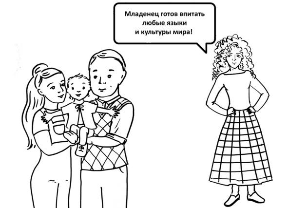 Не следует волноваться, если би- или полилингв начнет говорить позже, чем одноязычные дети. Ведь его мозгу нужно выполнить в два раза больше работы, чем мозгу его сверстников! И здесь принципиально важно, чтобы взрослый носитель каждого языка говорил с ребенком именно на своем родном языке и взаимодействовал с ним в рамках своей родной культуры, последовательно реализуя принцип «один человек — один язык». Это помогает ребенку выделить систему каждого из языков и каждой из культур. И уложить эти системы в своем сознании.