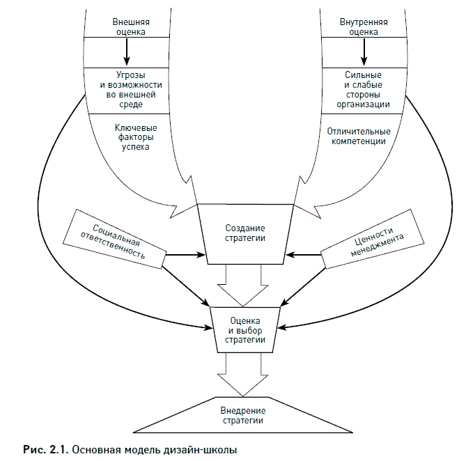 Школа дизайна (проектирования, конструирования, моделирования), вне всяких сомнений, выражает наиболее влиятельную точку зрения на процесс построения стратегии. Ее ключевые идеи лежат в основе университетских курсов стратегического менеджмента и часто используются на практике. Профессора, консультанты и специалисты по планированию бесчисленное множество раз писали на доске во время занятий и совещаний придуманную сторонниками дизайн-школы знаменитую аббревиатуру SWOT, означающую оценку сил (Strengths) и слабостей (Weaknesses), возможностей (Opportunities) и угроз (Threats).