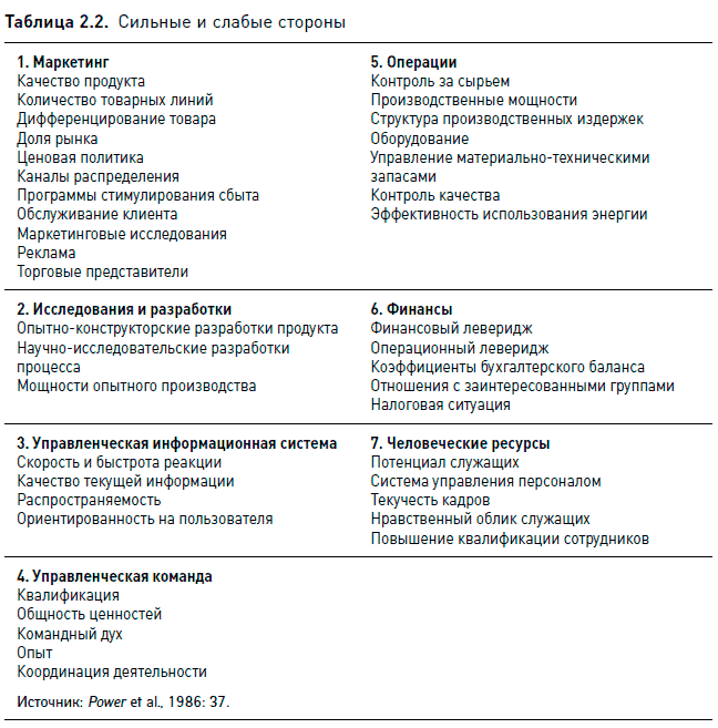 Несмотря на то что, как мы увидим, стратегический менеджмент как наука включает в себя несколько направлений, в большинстве стандартных учебников в качестве отправной используется модель SWOT. В табл. 2.1 и 2.2 представлены основные принципы внутреннего и внешнего подходов в том виде, в каком они предложены в одном из подобных пособий. Аналогично, несмотря на ту оценку, которую они дают новым методам, многие консультанты по стратегическому процессу опять-таки продолжают опираться на модель SWOT и другие понятия школы дизайна. Когда в 1980-х гг. голоса сторонников школы планирования немного поутихли, теоретики и практики вновь «заговорили» на языке дизайн-школы. Например, использовавшийся консультационной фирмой Kepner-Tregoe термин «закон экономии» есть почти прямая цитата из книги К. Эндрюса: «…следуйте стратегиям ясным, простым и конкретным» (Tregoe and Tobia, 1990: 16–17).