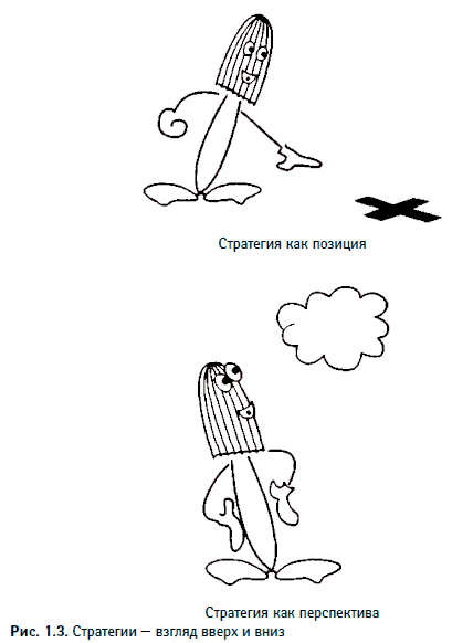 Существует мнение, что стратегия — это позиция, а именно расположение определенных товаров на конкретных рынках, например продукта Egg McMuffin на рынке завтраков. Как не так давно вновь повторил М. Портер, «стратегия представляет собой создание — посредством разнообразных действий — уникальной и ценной позиции» (Porter, 1996: 68). Есть также мнение, что стратегия — это перспектива, т.е. основной способ действия организации (например, McDonald’s), или, по незабвенному выражению П. Друкера, это «теория бизнеса» данной организации (Druker, 1970: 5; 1994). Как видно из рис. 1.3, стратегия как позиция — это взгляд вниз, на отметку «х», указывающую место встречи товара с покупателем, и вовне — на внешний рынок. С другой стороны, в качестве перспективы стратегия обращена внутрь — внутрь организации, точнее, в мысли стратегов, но одновременно и вверх — в большое будущее предприятия.