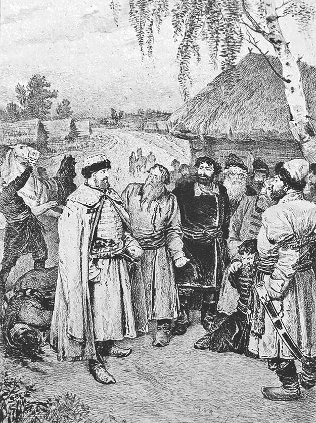 В это время два всадника показались на улице. Один из них, в кармазинном кафтане с золотыми кистями и в белой парчовой шапке, из-под которой вилися густые русые кудри, обратился к другому всаднику.