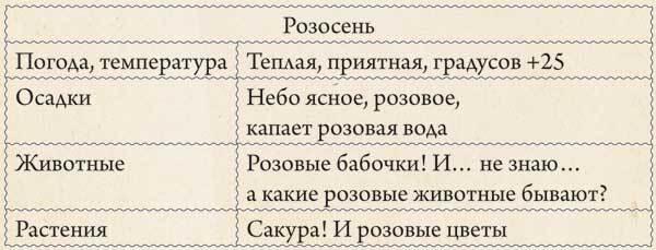 Мы вернулись домой, я повесила розовую курточку на вешалку, погладила Бодрика, легла на диван и укрылась пледом, чтобы согреться. Я точно хотела новое время года. Но какое? Я нарисовала разные варианты и остановилась на «розосени». Я вырвала листочек из тетрадки и начертила небольшую таблицу, похожую на те, которые вела мама на работе.