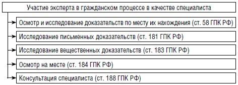 Ряд статей ГПК РФ регламентирует возможность судебно-медицинского эксперта участвовать в качестве специалиста в исследовании письменных и вещественных доказательств, в осмотрах на месте и др., если в этом имеется необходимость (схема 28).