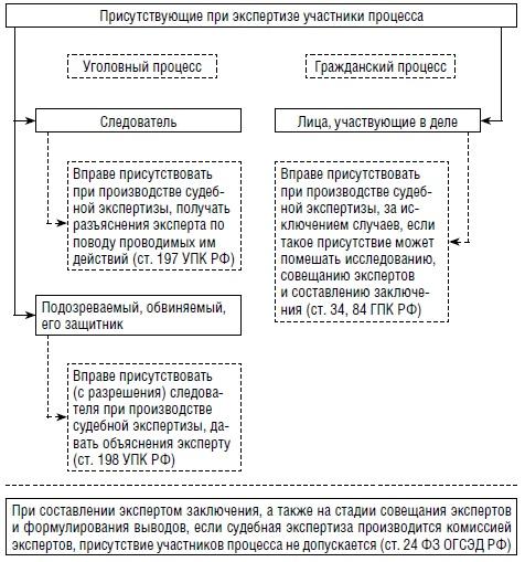 Схема 10. Присутствие при производстве судебной экспертизы участников уголовного и гражданского процесса (ст. 24 ФЗ ОГСЭД РФ; ст. 197, 198 УПК РФ; ст. 34, 84 ГПК РФ)