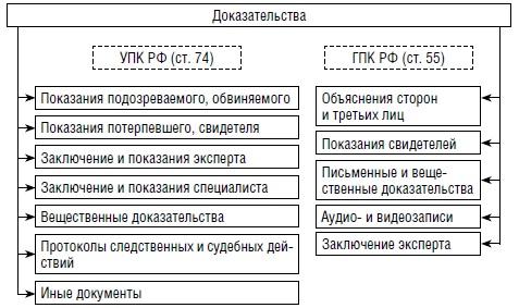 Схема 14. Виды доказательств в уголовном и гражданском процессе (ст. 74 УПК РФ; ст. 55 ГПК РФ)