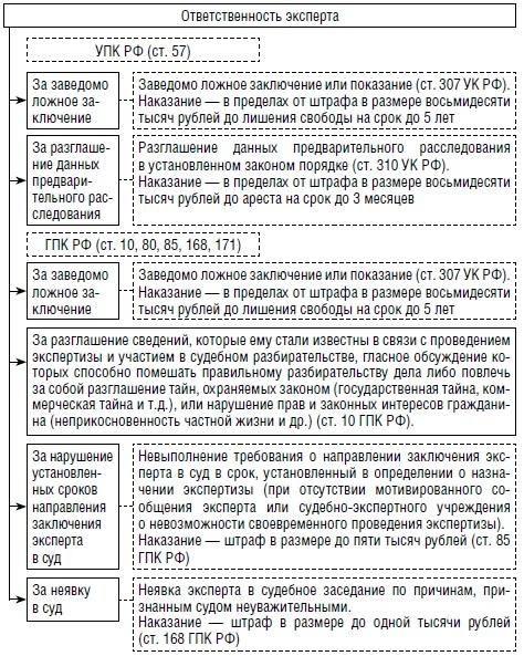 В соответствии со ст. 57 УПК РФ и ст. 10, 80, 171 ГПК РФ эксперт может нести уголовную и иные виды ответственности (схема 20).