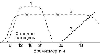 1 — трупное окоченение; 2 — трупные пятна; 3 — разложение. По оси абсцисс — время после наступления смерти, ч