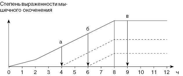 По оси абсцисс — время, ч; по оси ординат — степень выраженности мышечного окоченения. Стрелками (а), (б) и (в) указано время нарушения (разрушения) мышечного окоченения через 4, 6 и 9 часов после наступления смерти. Пунктирными линиями — динамика степени выраженности мышечного окоченения при его восстановлении (повторном развитии) после разрушения