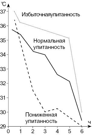 Рис. 17. Динамика падения температуры трупа в зависимости от упитанности [49]