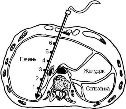 Горизонтальное сечение туловища трупа на уровне XII грудного позвонка. Цифрами (1–6) обозначены места расположения терморезисторов на 6-зональном термощупе