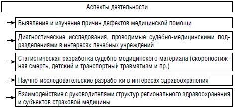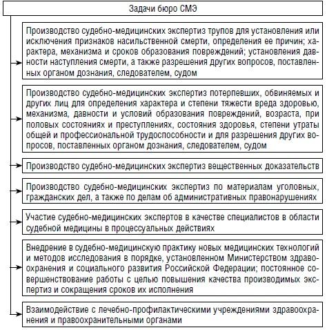 Все виды судебно-медицинской деятельности в Российской Федерации осуществляются в государственных учреждениях здравоохранения особого типа — Бюро судебно-медицинской экспертизы (бюро СМЭ), находящихся в ведении региональных (республиканских, краевых, областных, окружных и городских) органов управления здравоохранением субъектов Российской Федерации (министерства, департаменты здравоохранения и т. д.)1.