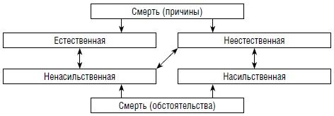 Выделяют медико-биологическую классификацию причин смерти и социально-правовую классификацию обстоятельств ее наступления (схемы 40–42).