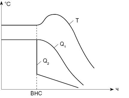 Рис. 10. Вероятные зависимости изменения значений теплообразования (Q1), теплоотвода (Q2) и температуры (T) внутреннего органа человека от времени после наступления смерти [29]