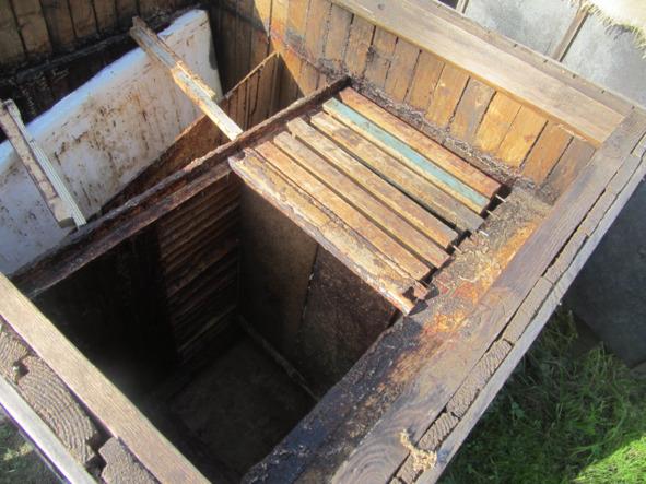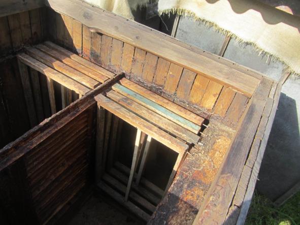 Я старался сделать его не очень тяжёлым. Дно из доски толщиной 40 мм, верхняя обвязка из доски в 20 мм; боковые, задние и передние стенки из дощечек по 10 мм. Улей со всех сторон обтянут полиэтиленовой плёнкой, а поверх её рубероидом. Улей тонкостенный. Так как зимовка пчёл предполагалась в переднем отделении, переднюю стенку я сделал двойной с утеплителем между стенками (полиэтиленовый мешок с опилками). Улей разделён на два отделения внутренней стенкой, выполненной из доски толщиной 40 мм с вертикальными щелями между досками в 10 мм.