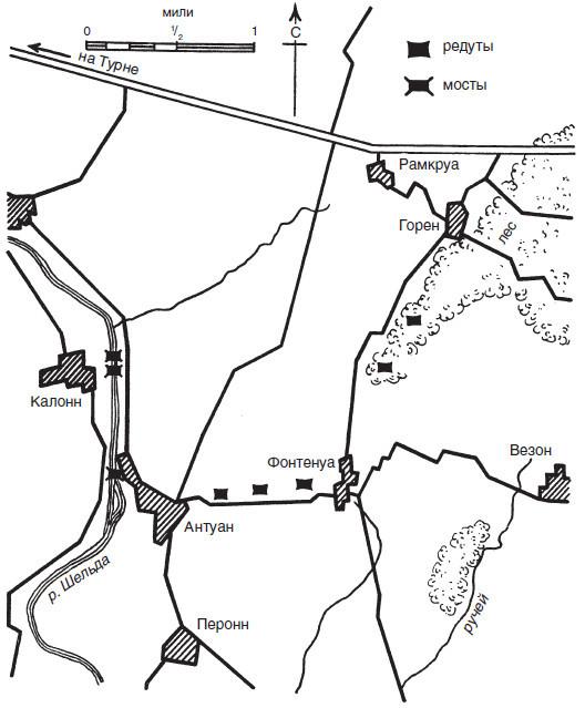 В конце концов, армии встретились при Фонтенуа (так называется гряда холмов и селение в Бельгии). Мориц Саксонский командовал французами, а герцог Камберлендский – британцами и их союзниками (голландцами и ганноверцами). Французов было около 80 тысяч человек (около 40 тыс. – Ред.); армия союзников – около этого (свыше 50 тыс. – Ред.). Для встречи ожидаемой атаки союзников Мориц приготовил систему баррикад, траншей, засек и три поддерживающих друг друга редута между селениями Фонтенуа и Антуан. Были построены еще два отдаленных редута. Как выяснилось позже, Мориц совершил ошибку, не соорудив шестой редут в центре 800-метрового промежутка между северной окраиной Фонтенуа и пятым редутом. У французов было 100 пушек впереди и вспомогательная батарея близ Антуана.
