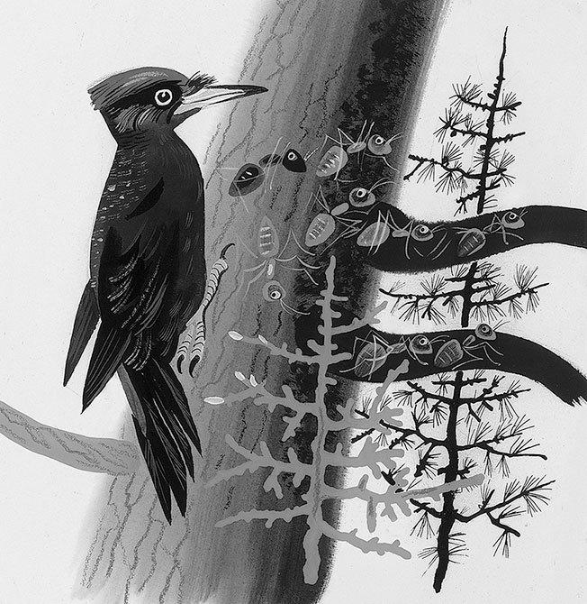 Тук-тук-тук! В глухом лесу на сосне чёрный дятел плотничает. Лапками цепляется, хвостиком упирается, носом постукивает, – мурашей да козявок из-за коры выпугивает; кругом ствола обежит, никого не проглядит. Испугалися мураши: «Эти-де порядки не хороши!» Со страху корячатся, за корою прячутся – не хотят вон идти. Тук-тук-тук! Чёрный дятел стучит носом, кору долбит, длинный язык в дыры запускает: мурашей, словно рыбку, таскает.