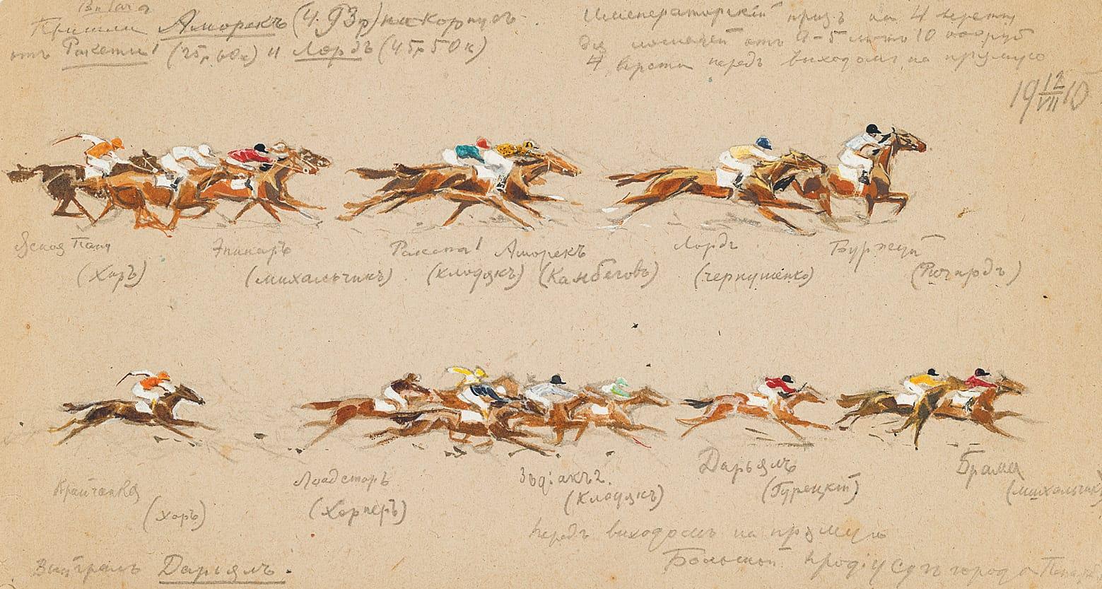 Я много рисовал „от себя“ — по памяти. Часто после того, как я „зарядился“ рассматриванием лошадей, я сам мчался, как конь, чтобы скорее зафиксировать виденное. Зрительная память развивалась очень быстро при подобных упражнениях. Смотреть, наблюдать я мог по несколько часов, не проронив ни слова» [6].
