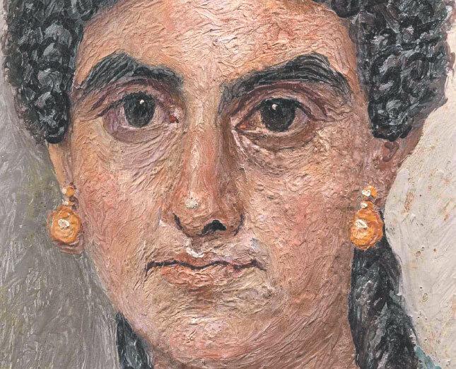 Еще один интересный нюанс фаюмских портретов – прическа, которая помогла современным ученым определиться с датой создания той или иной работы. Например, у девушки с работы «Женщина в голубой накидке» волосы заплетены так же, как их заплетала Юлия Августа Агриппина, мать императора Нерона. Подобные повторения были данью моде: любая уважающая себя девушка должна была следить за трендами, которые задавала женская половина императорской семьи. Император правил в I веке н. э., значит тогда и появилась данная работа.