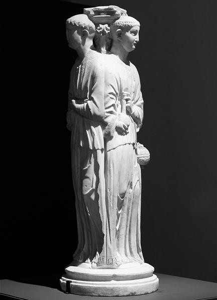 РИС. 3. ТРИ АКОЛИТА. Одна из четырех опор саркофага святого Доминика из церкви Сан-Доменико в Болонье. Мастерская Никколо Пизано, Арнольфо ди Камбио (?). Вторая половина XIII в. Мрамор. Флоренция, Национальный музей Барджелло. Фото О. С. Воскобойникова