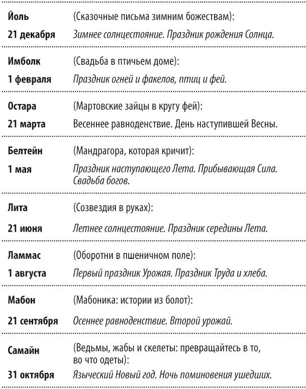 Но мы с вами будем находить разные соответствия к празднику и складывать пазл из разных магических кусочков с помощью подсознания. А чтобы вам было легче, я все же опишу основные детали для каждого из восьми праздников. Может быть, это и не пригодится и отмечать вы будете по старинке. Но если вы хотите поймать зимних фей, отправиться в путешествие в прошлое, попытаться создать гомункула, ухаживать за мандрагорами, общаться с божествами и следить за своим домом вместе с домовым во время Ламмаса — тогда вперед!