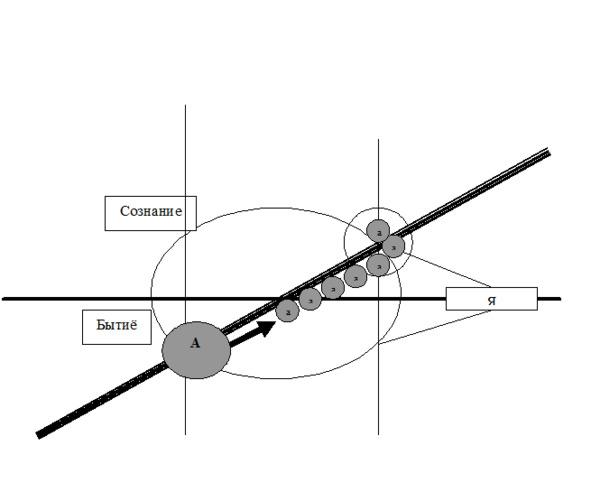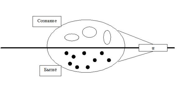 В нижней половинке — всё, что мы обычно относим к нашему БЫТИЮ. Здесь вся поступившая к нам энергия впечатлений — сигналы всех наших органов чувств, все алгоритмы их первичной обработки, все двигательные стереотипы, то есть весь внешний мир в той форме, в которой мы его воспринимаем.