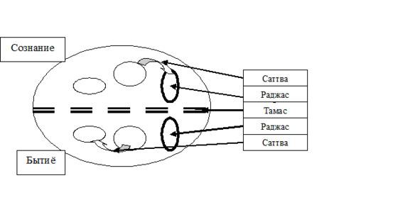 Нижний уровень нашего «я» является зеркальной копией верхнего уровня и также представлен тремя силами или тремя элементами: ТАМАС, РАДЖАС и САТТВА