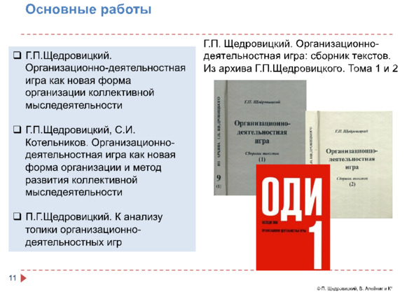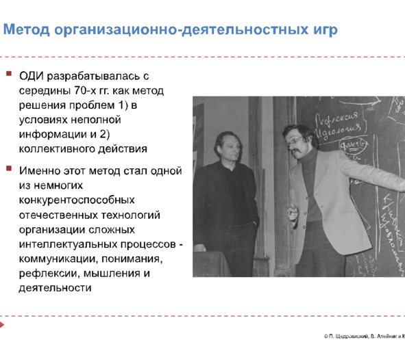 Я обращаю ваше внимание на то, что вне контекста философско-методологических разработок Московского методологического кружка (далее — ММК) невозможно ничего обсуждать про организационно-деятельностные игры (ОДИ). ОДИ — это один из результатов всей этой длительной работы.