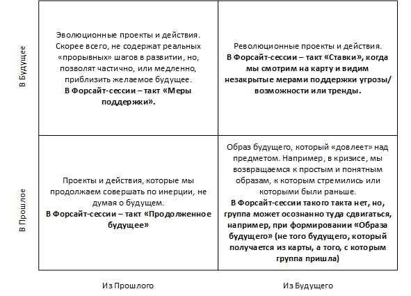Квадрат «Из Прошлого» — «В прошлое». Если идти «из прошлого» «в прошлое», то не будут получены проекты развития. Это, скорее всего, проекты сохранения «статус-кво», которые не дают субъекту качественного прорыва и не проблематизируют будущим.