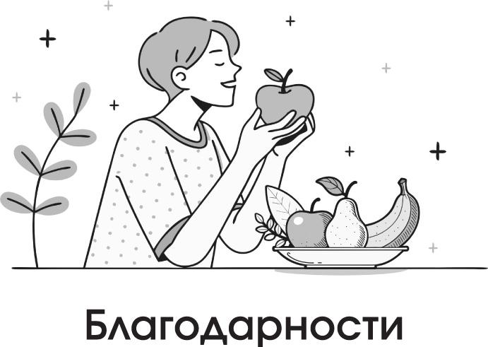Мне повезло встретить за эти годы многих замечательных наставников. Особая благодарность — моему консультанту по дипломной работе, Сюзанне Маццео, которая позволила мне, когда я была аспирантом, реализовать мою идею провести рандомизированное клиническое исследование. Я и понятия не имела, что это заложит фундамент моей карьеры и познакомит меня со столькими чудесными людьми. Благодарю Трейси Л. Тилка за то, что она внесла интуитивное питание в план исследований и пригласила меня поучаствовать в работе по данной теме. Я благодарю своих друзей (Сэма, Мэллори, Теда, Билла), которые подбадривали меня и выслушивали бесконечные рассказы о проблемах при написании книги. Я благодарна своим редакторам Райану и Мэдисон за ободряющие отзывы и терпеливое отношение ко мне в течение последнего года, когда я переживала по поводу сроков. И спасибо моим родителям — я знаю, вы не вполне понимаете, чем я занимаюсь каждый день (об этом говорят веселые звонки мамы, просто чтобы поздороваться в два часа дня, когда я работаю), но тем не менее бесконечно гордитесь мною. Вы всегда позволяли мне смело идти в том направлении, в котором я хотела. Если бы вы не воспитали во мне этой смелости, данной книги не было бы.