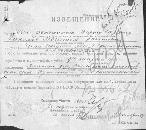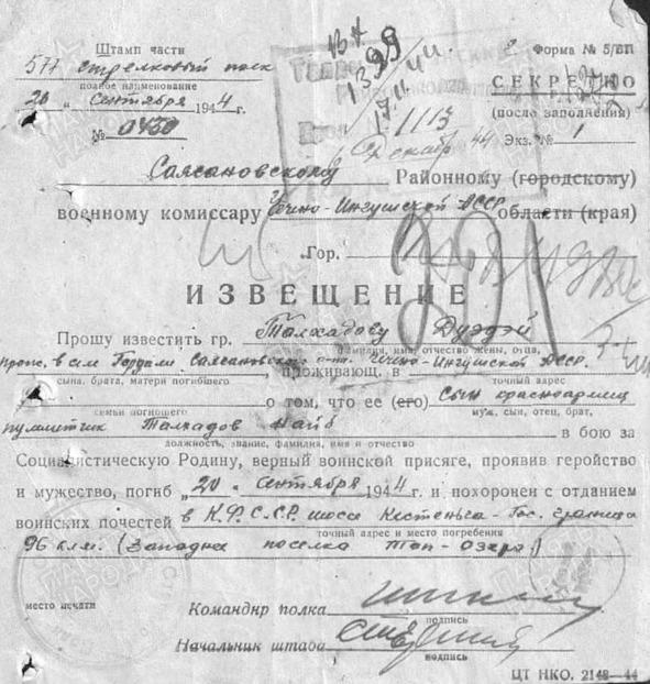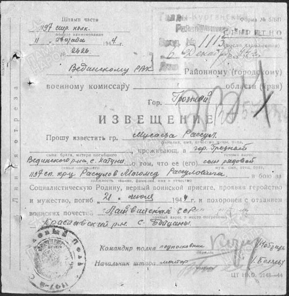 Трудно судить, что все-таки являлось главной причиной применения высшей меры наказания — выселение целого народа, потому что для Чеченца и Ингуша жизнь вне территории своей Родины равносильно потере Жизни. Эта же страшная мера была применена и к другим народам советские Немцы, Карачаевцы, Балкарцы, Калмыки, Крымские Татары, Турки Месхитинцы и другие. Чечено-Ингушетия во время Великой Отечественной Войны не была оккупирована, Чеченцы и Ингуши участвовали в войне против Гитлеровской Германии на всех фронтах во всех родах войск. Чечено-Ингушетия поставила для фронта миллионы тонн нефти и нефтепродуктов, сотни тысяч тонн пшеницы, кукурузы, шерсти и многое другое.